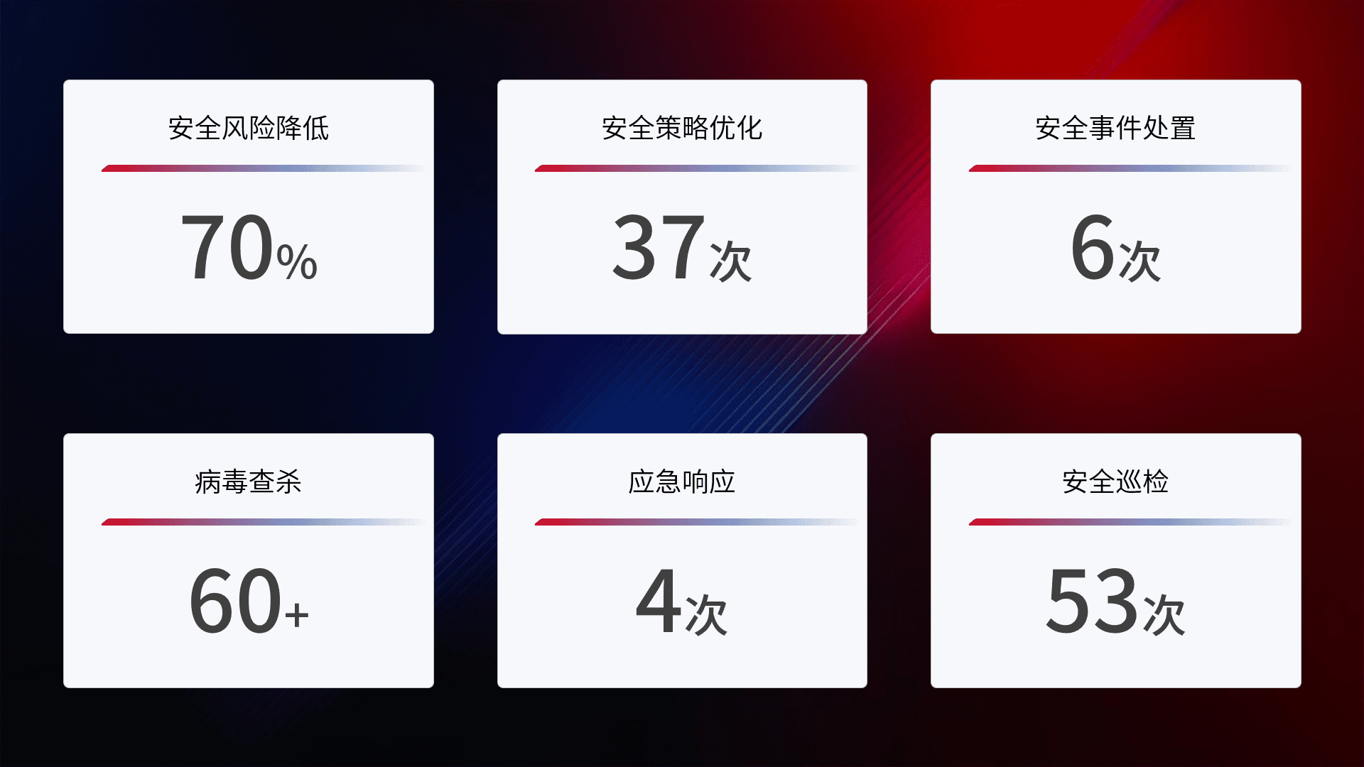 提供全面的安全事件报告体系,,,包括处置报告、、、、周报、、、季度和年度总结,,,结合持续监控,,帮助客户深入了解网络安全状况。。